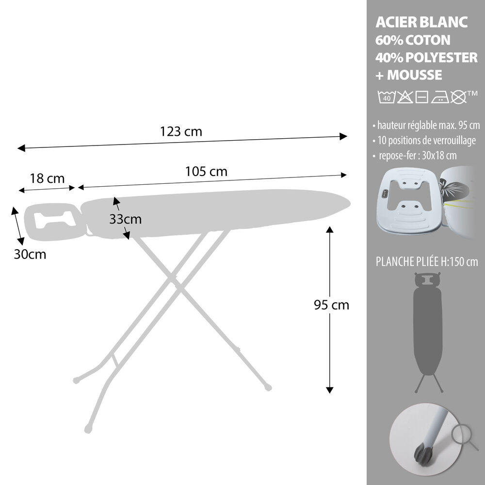 גובה מתכוונן ויציבות מרבית: קרש הגיהוץ מציע 10 מצבי כוונון גובה, המאפשרים לכם לכוונן אותו עד 90 ס"מ בהתאם לצרכים שלכם.