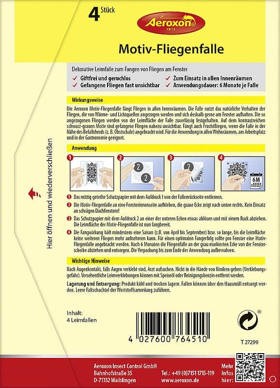 מלכודת הזבובים המלכודת משתמשת בהתנהגות הטבעית של הזבובים, הנמשכים למקורות חום ואור ולכן אוהבים לשהות ליד החלון. הזבובים הנמשכים בדרך זו מוחזקים במקומם על ידי המשטח המודבק של המלכודת. לוכד גם זבובי פירות אם מניחים את המלכודת ליד מקור הנגיעות (למשל קערת פירות). מתאים לשימוש בכל חדרי המגורים